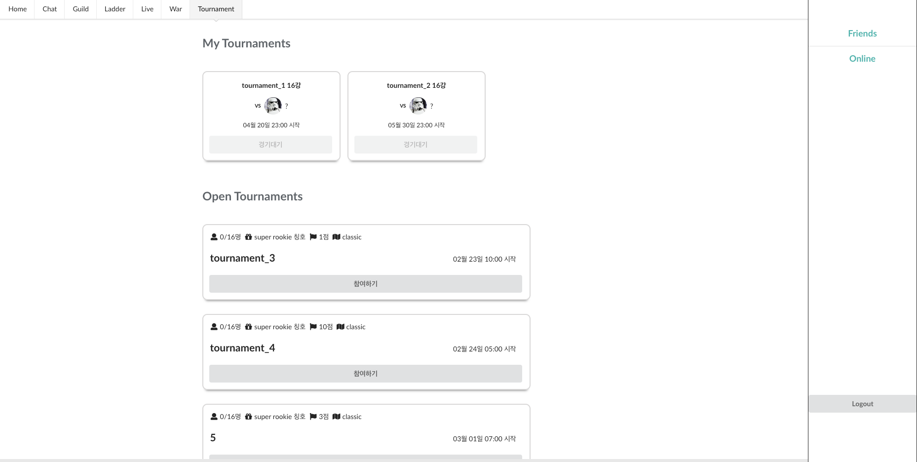 • My tournament ํŽ˜์ด์ง€์—๋Š” ํ˜„์žฌ ์ฐธ์—ฌํ•œ ํ† ๋„ˆ๋จผํŠธ์˜ 'next_match' ์ •๋ณด๊ฐ€ ์นด๋“œํ˜•ํƒœ๋กœ ํ‘œํ˜„๋ฉ๋‹ˆ๋‹ค.